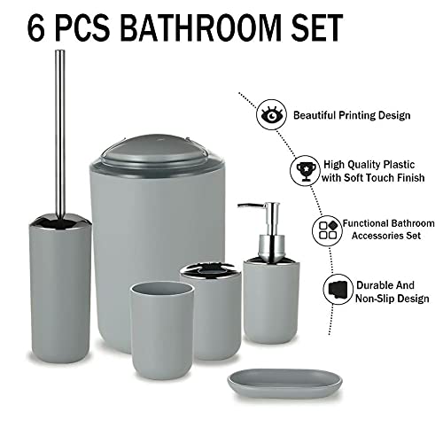 JOTOM Accessori per il Bagno Design Moderno Set di 6 Pezzi di Plastica Set di Sapone emulsione Scatola Denti Tazza da Toilette Pattumiera (Grigio)