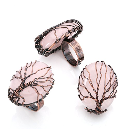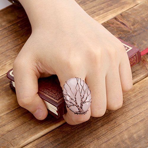 Jovivi Anello Regolabile in Rame a Forma di Albero della Vita con Ovale Naturale Cristallo Pietra Preziosa Donna- Quarzo Rosa