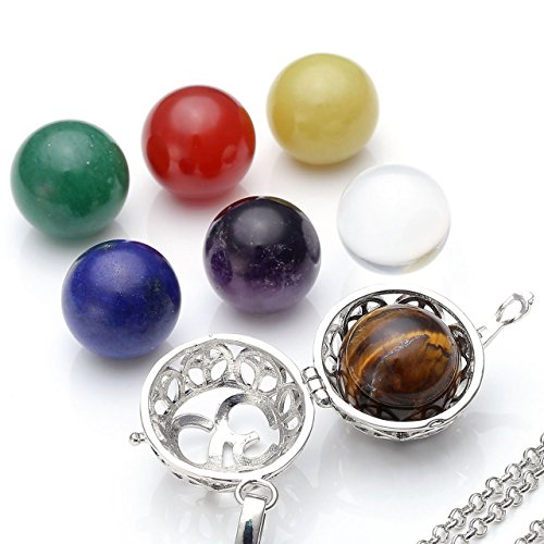 Jovivi Collana con ciondolo apribile a forma di simbolo OM argentato + 7 pietre Chakra naturali tibetane, perle rotonde buddiste, 16 cm