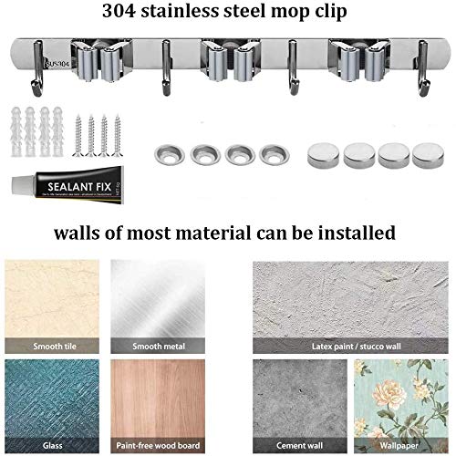 【 Risparmio di spazio】il mop clip con 4 clips e 5 ganci per scopa, mop, rastrelli, spolverini, ombrelli, utensili da cucina e attrezzi da giardinaggio, Il nostro portaspazzole ti aiuta a mettere in ordine la tua casa e la tua vita, non avrai mai problemi a trovare gli strumenti.