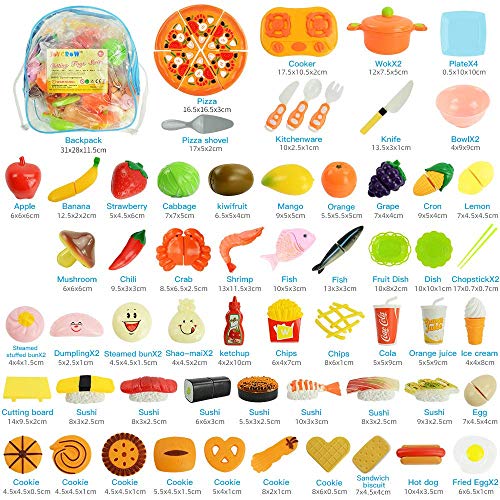 [70 Pezzi Tagliare Giocattoli con Zaino]: 1 pizza grande, 13 frutta e verdura, 4 frutti di mare, 8 pasticcini cinesi, 10 fast food, 8 sushi, 8 biscotti, 18 stoviglie. Questa tuta ha anche uno zaino per gli accessori. È adatto a tutte le occasioni all'aperto ed è un giocattolo essenziale in viaggio.