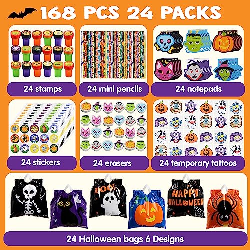 SUPER VALORE con 24 confezioni assortite set regalo di cancelleria di Halloween con 6 disegni in sacchetti dolcetto o scherzetto! L'intero set include 24 borse di Halloween, 24 blocchi per appunti, 24 tatuaggi temporanei, 24 mini matite, 24 timbri, 24 adesivi e 24 gomme per cancellare