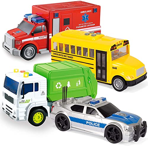 JOYIN Set di 4 giocattoli per veicoli da gioco alimentati ad attrito per PC Auto della polizia, scuolabus, camion della spazzatura, ambulanza, veicolo giocattolo con luci e sirena sonora