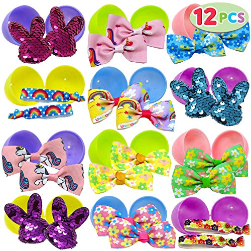 Il set di 12 uova di Pasqua colorate preriempite include 14 fiocchi per capelli con design a fiore e unicorno, 4 nastri in grosgrain con design arcobaleno e fiore e 6 forcine per capelli con glitter a forma di coniglietto.