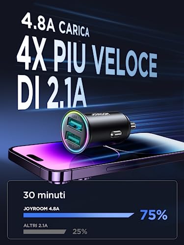 4,8A CARICATORE: ogni porta del presa usb auto può fornire 2,4A/12W al dispositivo. Con una potenza di carica totale di 4,8A/24W, questo accendisigari usb è in grado di caricare più velocemente rispetto ai tradizionali 1A/5V. Può caricare l'iPhone 14 da 0% a 55% in 40 minuti.