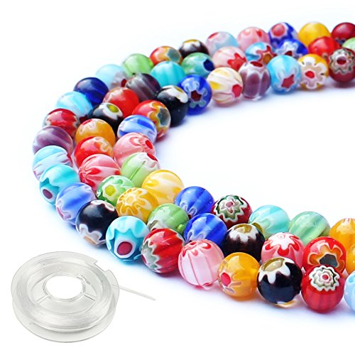 JPSOR 2 Fili di perline rotonde di vetro con fiore singolare in colore misto da 6mm, 136 perline grandi, un rotolo di filo elastico per perline, per realizzazione di gioielli, contiene un sacchetto di tessuto non tessuto