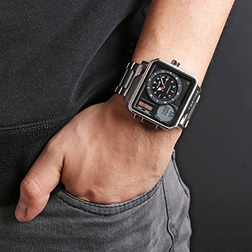 Jsdde, Orologio digitale da polso multifunzione da uomo, con quadrante quadrato, elettronico, al quarzo, con doppio movimento e retroilluminazione, con cinturino in acciaio e schermo LCD, impermeabile fino a 3 atm, stile casual e sportivo