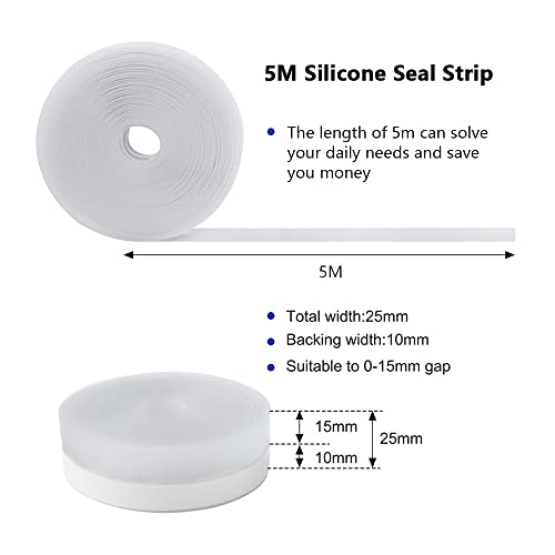 Dimensioni: La sua lunghezza totale è di 5 metri, la larghezza totale è di 25 mm, retro adesivo larghezza 10 mm e spessore 0,5 mm. Può essere utilizzato per sigillare spazi vuoti da 0 a 15 mm.