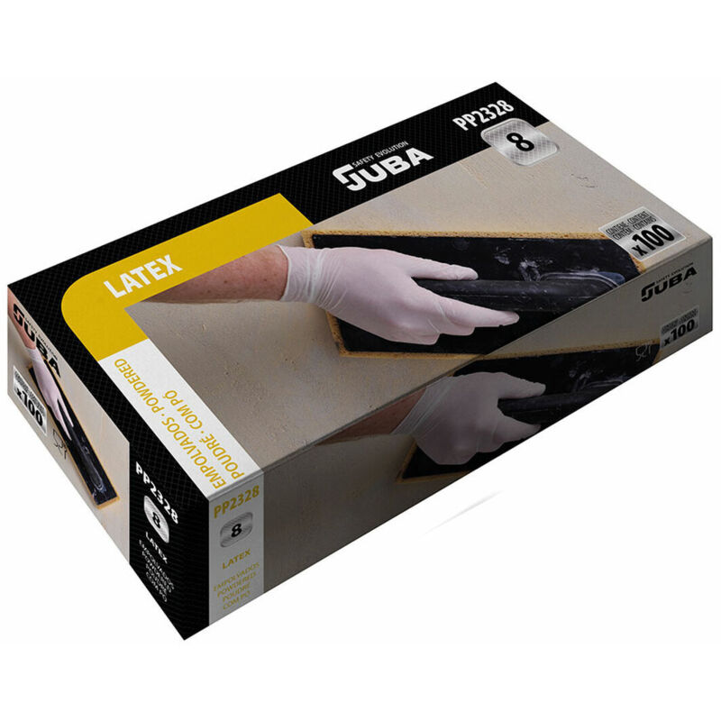 Scatola di 100 guanti monouso in lattice juba con polvere, taglia 7. guanto economico in polvere, cat 1, spessore 0,07 mm, certificato per uso alimentare, colore naturale, ce, alq 1,5. in scatola dispenser.
