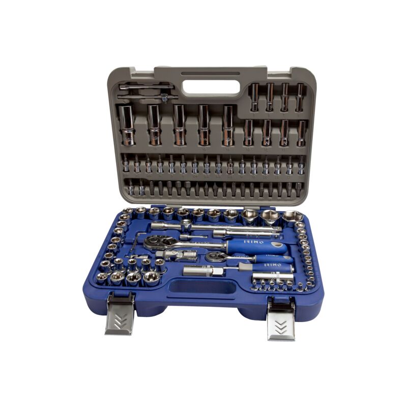 Irimo - Set di bussole 1/4-1/2 108 pezzi - 129-108-4 - Set di bussole 1/4 6,3 mm e 1/2 12,5 mm - Bussole esagonali, dimensioni metriche - Finitura cromata lucida - Norme: DIN3120, DIN3124, DIN3122, ISO10102 - Custodia in polietilene ad alta densità - Valigetta con serrature in metallo Specifiche tecniche: Numero di parti: 108 Dimensioni: 380x280x80 mm Peso: 7100 g