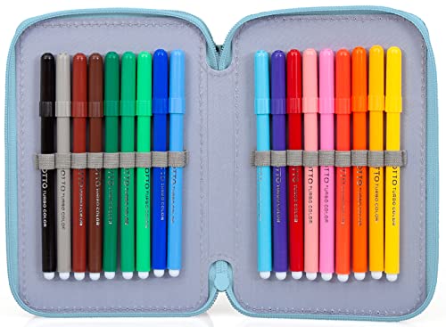 Contenuto astuccio: triplo scomparto, 1 penna a sfera blu, 1 penna a sfera rossa, 2 matite, 1 gomma, 1 temperino, 1 righello, 1 forbicine, 18 pastelli Julian Ross colorato 3.00mm, 18 pennarelli Giotto.