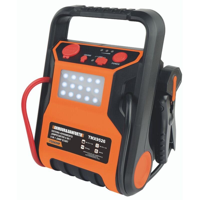 Jump starter - Led luce lavoro - compressore - porta USB Attacco accendisigari 12V Batteria ricaricabile sigillata al piombo 12V ON/OFF Protezione automatica da sovraccarico, led 18pz Potenza di Picco: 700Amps picco / 200-400Amps iniziale Compressore d'aria 250PSI 1 presa di uscita DC 12V 1 porta USB da 5V. Indicatore di inversione di polaritàIndicatore LED dello stato della batteria Adattatore AC/DC incluso Misure prodotto:30*23.5*17cm. NOTE EXTRA: Grande Capacità, Porta USB, Può Aiutarti A Ricaricare Il Tuo Telefono, Laptop, IPad E Altri Prodotti Digitali. Ideale per automobili, motociclette, imbarcazioni, trattori, camion, SUV, auto d'epoca, auto sportive, tosaerba, quad, motoslitte, e altro. Completo di cavo con pinze.