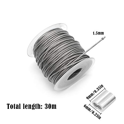 ★ Confezione: un rotolo di 30 m x 1,5 mm di corda in acciaio, 30 pezzi di morsetto per corda