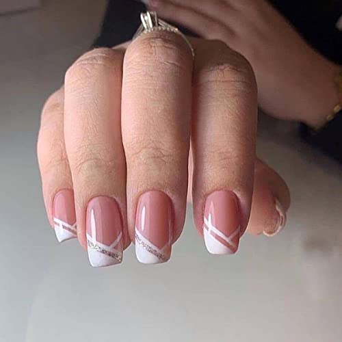 Juneyemo Unghie finte quadrate francesi rosa, 24 pezzi, lucide a stampa su unghie di lunghezza media, copertura completa, per donne e ragazze (B)