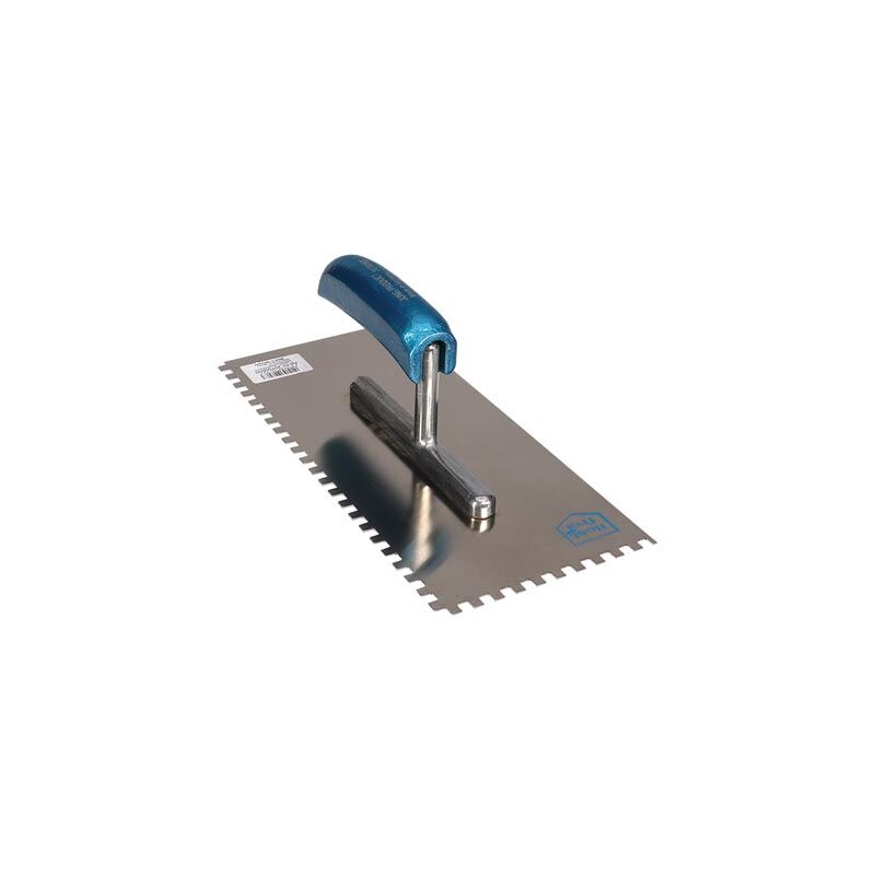 Informazioni sul prodotto Primärfarben Blau,Tiefe des Produkts 280 mm,Breite des Produkts 130 mm,Gewicht Produkt 300 g,Material Edelstahl Proprietà fisiche Form Rechteckig,Art der Verzahnung Quadratisch 12 x 12 mm,Material des Handgriffs Holz,Typ des Handgriffs Gebogen,Kelle Typ Verputzkelle Dimensioni dell'imballaggio 1