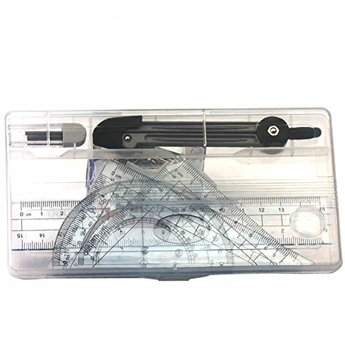 Confezione: 1 bussola da disegno, 2 righelli triangolari, 1 goniometro e 1 tirante.