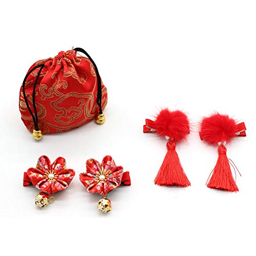 Il pacchetto include: 1 paio di fermagli rossi per capelli, 1 paio di fermagli per capelli rossi a forma di fiore di ciliegio, 1 sacchetto rosso con coulisse per il nuovo anno