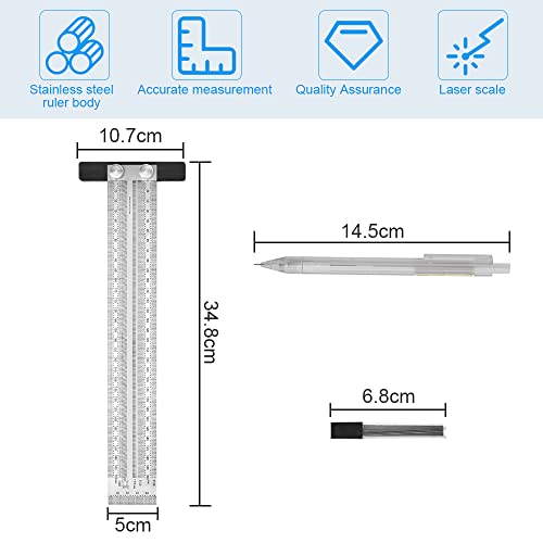 JUNMEIDO Righello di Tipo T Righello Lavorazione del Legno T-Rule di Marcatura Ultra Preciso con Fori Strumenti di Misurazione del Calibro Della Linea di Incisione con 1 Matita e 1 Tubo di Ricarica