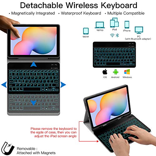 JUQITECH,Custodia con tastiera retroilluminata per Samsung Galaxy Tab S6 Lite da 10.4", custodia per tastiera wireless staccabile con supporto per penna a S, colore: Nero