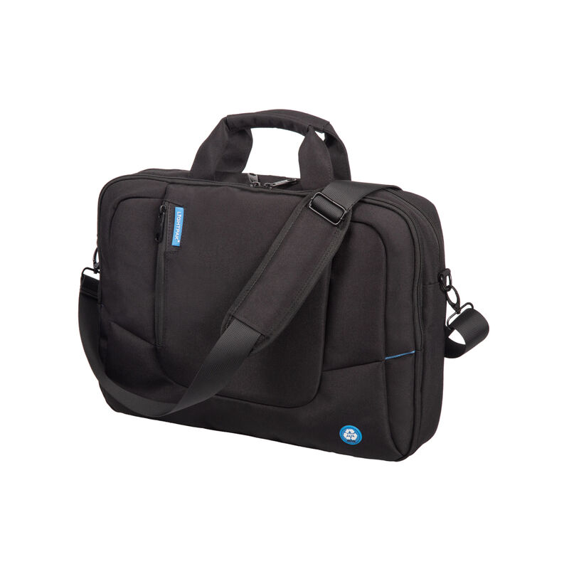 Borsa nera per laptop realizzata in PET riciclato. Schienale con ampio scomparto a scomparsa. Con tracolla per trolley, tracolla rimovibile, scomparto imbottito per laptop (fino a 17") e tasca frontale con 3 tasche a bustina. 3 tasche per biglietti da visita e 2 portapenne/stilo.