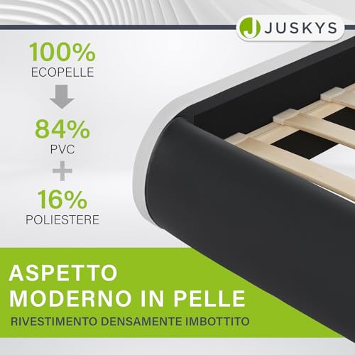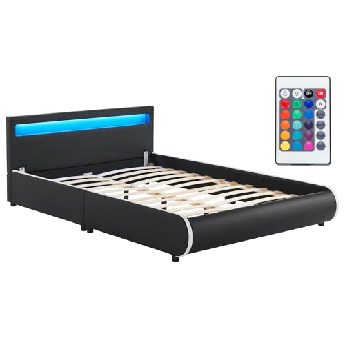 Juskys letto imbottito Sevilla da 140x200 cm - Struttura letto con illuminazione LED, rete a doghe e similpelle - Nero - Letto per ragazzi