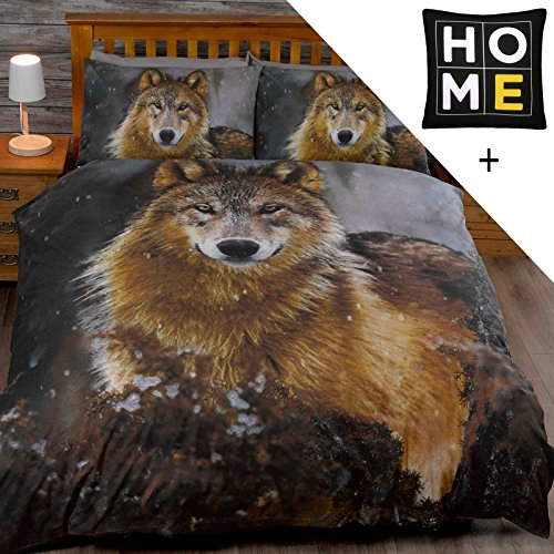Just Contempo - Copripiumino Matrimoniale + copricuscino, in policotone, motivo: Lupo, Misura King