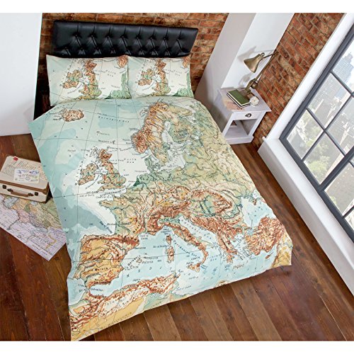 Just Contempo - Copripiumino con stampa vintage di mappa cittadina set di biancheria da letto colore: Verde azzurro e multicolore Cotone Multicolore copripiumino matrimoniale