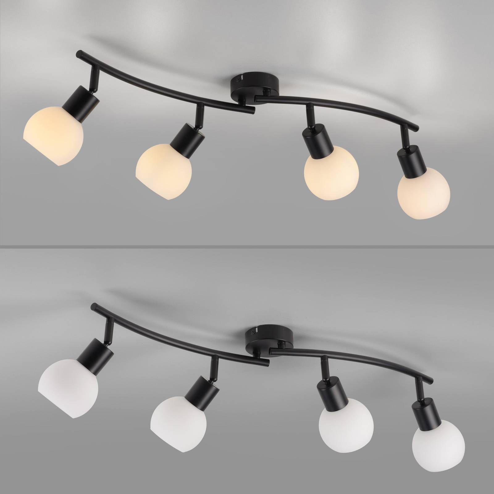 Plafoniera Loki in ferro e vetro, a 4 luci con plafoniere LED E14 La lunga plafoniera Loki a 4 luci è costituita da una struttura in ferro laccato nero e da quattro paralumi in vetro quasi sferici. Si tratta di un apparecchio versatile per molte aree della casa, come soggiorni, corridoi e camere da letto. Le luci possono essere regolate a piacere. Le lampadine LED con base E14 e colore di luce bianco caldo sono incluse e possono essere sostituite.
