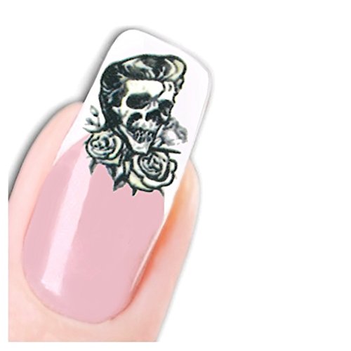 JUSTFOX - Tatuaggio per unghie con teschio con rose e acconciatura Elvis