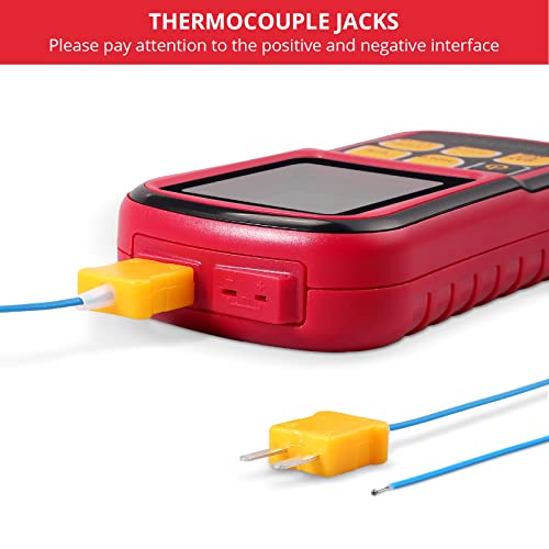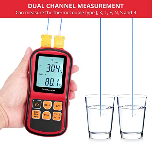 Termometro digitale professionale: questo è un termometro digitale professionale con 2 termocoppie esterne di tipo K per la misurazione delle alte temperature. È possibile sostituire le termocoppie con tutti i connettori standard della termocoppia di tipo K, anche sostenere altri tipi di termocoppie, J/T/E/N/R-tipo