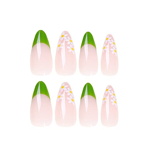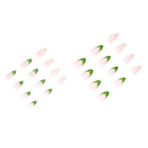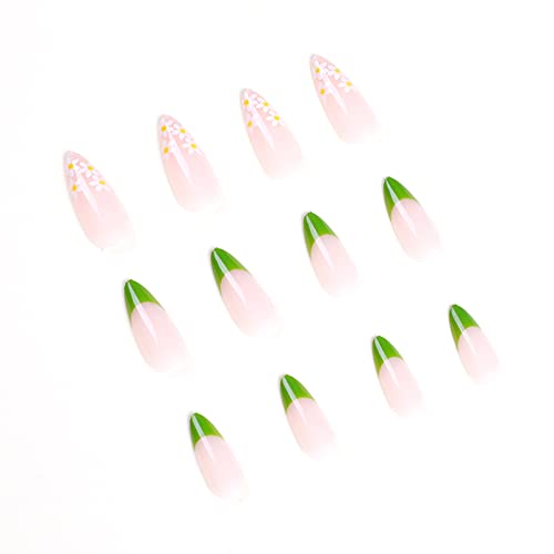 JUSTOTRY 24 pezzi pressa per mandorle su unghie corte, unghie finte francesi verdi con motivi floreali, stick su unghie da donna, unghie finte in acrilico con colla per nail art