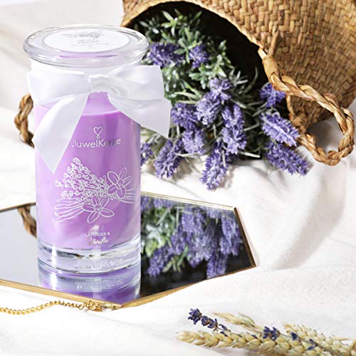 JuwelKerze Fresh Lavender & Vanilla Bracciale argento - Candela portagioie 80 ore - grande candela profumata con profumo floreale - candela lilla con sorpresa gioielli - regalo per donne, compleanno