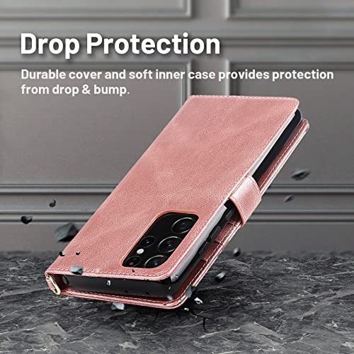 JWS-C Cover Samsung Galaxy S21 Ultra Custodia Portafoglio in pelle PU di lusso {Blocco RFID} con porta carte Cordino protettivo antiurto Polsino Flip per Samsung S21 Ultra-Oro rosa