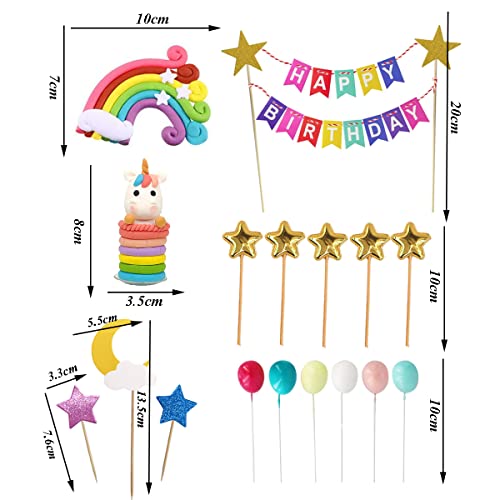 Set di decorazioni per torte per gli amanti degli unicorni: 1 unicorno, 1 topper glitterato arcobaleno Happy Birthday, 1 arcobaleno, 6 palloncini, 5 stelle.
