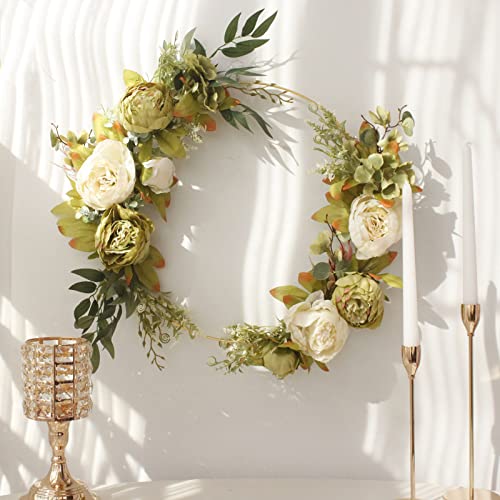 JYCAR Corona a cerchio in metallo con peonia artificiale, motivo floreale, a forma di rosa, con eucalipto, verde, in metallo, per porte d'ingresso, per interni ed esterni, sfondo per arco di nozze