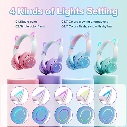 Luci di accensione/spegnimento/impostazione del colore: è possibile accendere/spegnere le luci a LED quando si utilizzano le cuffie per gatti come preferisci. Tranne questo, è possibile impostare i colori sulle cuffie per bambini in un colore stabile (blu, verde, viola e rosso) o impostare in luci colorate incandescenti. Questo è ciò che è diverso dalle cuffie wireless di altri bambini.