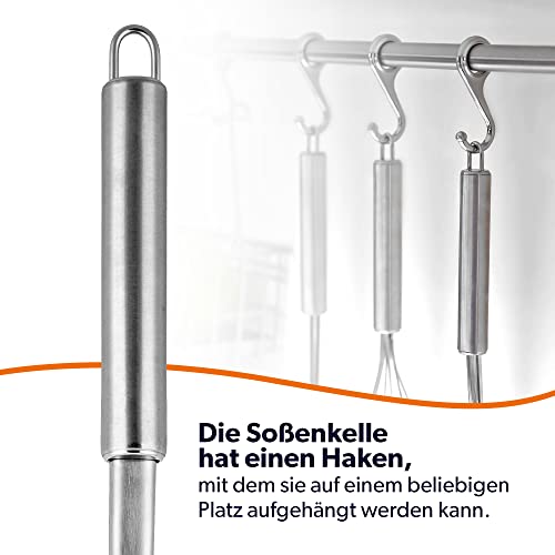 La Sossenkelle ha un gancio con cui può essere appeso in qualsiasi posto per essere sempre a portata di mano durante la cottura. Il prodotto è in lavastoviglie, il che significa che puoi risparmiare molto tempo durante la pulizia dopo una festa o una celebrazione. La lunga maniglia ergonomica garantisce il disegno sicuro e l'irrigazione di pomodoro, pesce, talenne, pesto o bolognes saoss.