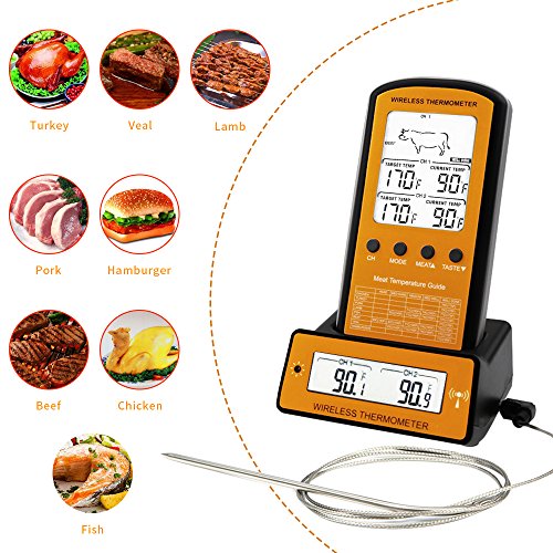 【Termometro portatile per barbecue】: termometro remoto senza fili, cavo sonda da 5 m, rende il barbecue esterno interresant e comodo. Contiene batteria. La trasmissione radio può arrivare fino a 60 metri e può essere ricevuta ovunque nella casa. Allarme di temperatura (che può essere impostato da solo).