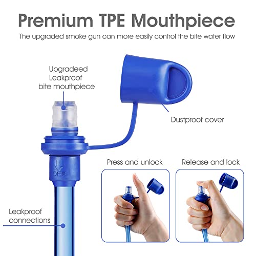 Facile da usare: la sacca d'acqua da 2 litri è dotata di un tappo antipolvere per evitare l'ingresso di polvere. Per bere, basta rimuovere il tappo antipolvere, aprire la valvola on/off e mordere delicatamente la sacca d'acqua da 2 litri per bere l'acqua.