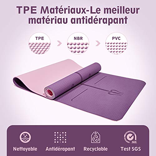 KAINOS - Tappetino da yoga spesso, antiscivolo, ecologico, in TPE 100% riciclabile, con indicazioni di allineamento del corpo, 183 x 61 x 6 mm, colore: Viola