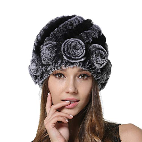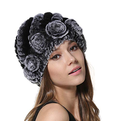 KAISHIN Cappelli di Pelliccia di Coniglio Invernale Berretti Stile Floreale Cappellini di Vera Pelliccia Lavorati a Maglia da Donna (Nero Grigio)