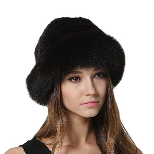 KAISHIN Cappello da Pescatore Invernale in Pelliccia di Visone per Donna Cappelli Fedora in Vera Pelliccia a Maglia con Bordo in Pelliccia di Volpe (Nero)