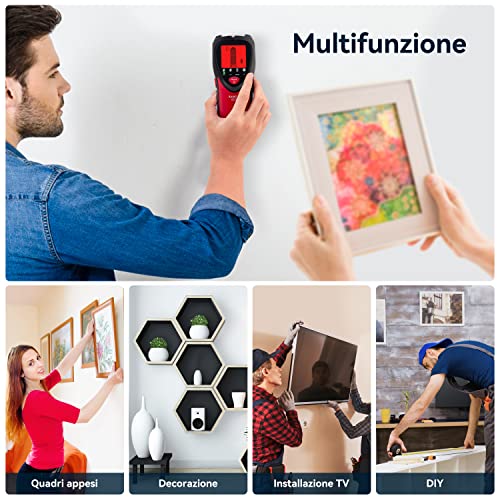 WALL SCANNER DI METALLI E TRAVI: Adatto per trovare punti adatti per praticare fori, ad esempio durante l'installazione di cartongesso. La profondità di rilevamento di legno/metallo è fino a 3,8/6,0 cm.