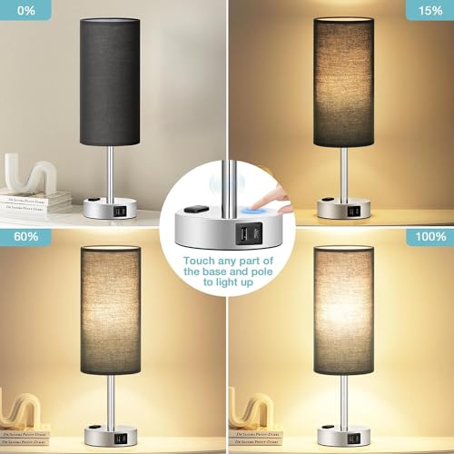 Kakanuo Lampada da Comodino Touch Dimmerabile, Lampada da Tavolo con Porte USB-C+A+Presa, Paralume Nero Base Nero, Abat Jour da Comodino per Camera da Letto Soggiorno Ufficio(Lampadina Inclusa)