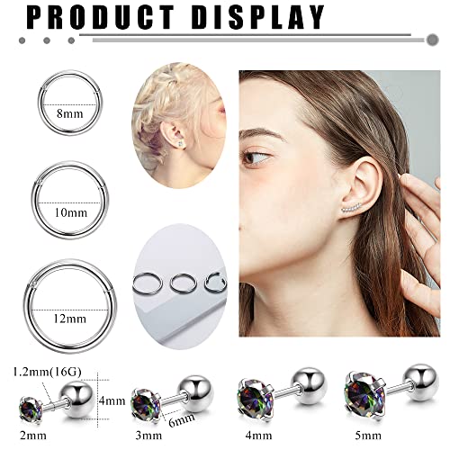 Kakonia 18Pcs 16G 316L Acciaio Chirurgico Piercing Orecchio per Donna Uomo Cubic Zirconia Cartilagine Orecchino Trago Stud Helix Piercing Orecchini Set