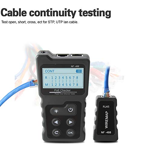 Test di continuità, mappatura dei cavi RJ45: Per cavi CAT5/6, controllo dei cavi UTP/STP, indica discontinuità filo per fili, lunghezza massima testata 600 m. Mostra sullo schermo lo schema di cablaggio. Ti permette di leggere se il cavo è dritto o incrociato, oppure puoi trovare se uno degli 8 fili di un cavo RJ45 è tagliato o ha un contatto sbagliato.