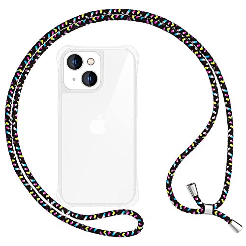 Kaliroo Cover Chiaro con Cordino compatibile con iPhone 14 Plus Custodia, Trasparente Anti-Giallo Copertura Rigida & Banda, Guscio Resistente Protettiva & Laccio Tracolla, Colore:Multicolore Nero