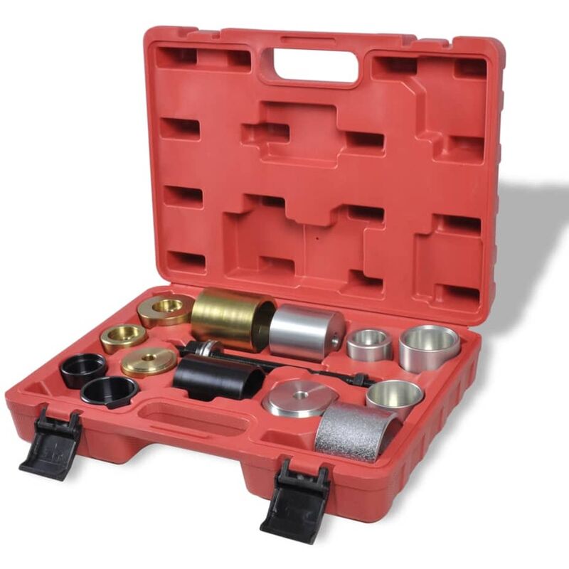 Questo è un set di strumenti professionali per l'uso commerciale o fai-da-te. Il kit sarà l'aiuto ideale per rimuovere ed installare giunti sferici, boccole e cuscinetti per numerosi modelli BMW dalla serie 1 alla serie 8. Questo set di strumenti per cuscinetti silenziosi è progettato per durare a lungo nell'uso quotidiano dell'officina e classificato di qualità industriale. Tutti gli strumenti sono ordinati in una custodia soffiata per facilitare la conservazione ed il trasporto. Set di attrezzi per cuscinetti silenziosi per BMW, 16 pz come sotto Una barra di alimentazione: Lunghezza: 225 mm Dimensioni filettatura: M12 x 1,5 mm Lunghezza chiave esagonale: 8 mm Utilizzato per azionare il cuscinetto silenzioso Un dado mandrino: Dimensioni filettatura: M12 x 1,5 mm Lunghezza chiave esagonale: 19 mm Un dado di compressione (con cuscinetto a gola assiale): Dimensioni filettatura interna: M12 x 1,5 mm Lunghezza chiave esagonale: 24 mm Un manico di supporto (spacchi laterali): Diametro