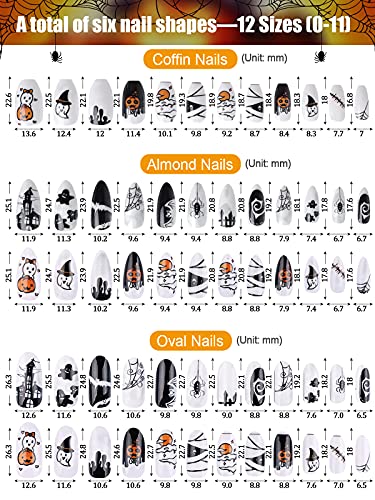 QUANTITÀ SUFFICIENTE DI UNGHIE FALSE DI HALLOWEEN - Riceverai 240 pezzi di unghie finte in modelli assortiti nella confezione, 10 fogli disponibili in molte dimensioni e diversi simboli di Halloween con disegni di unghie finte. Le unghie finte possono essere applicate in modo intercambiabile per dare alle tue unghie un aspetto a strati, disegni alla moda e carini per stupire la tua vacanza di Halloween.