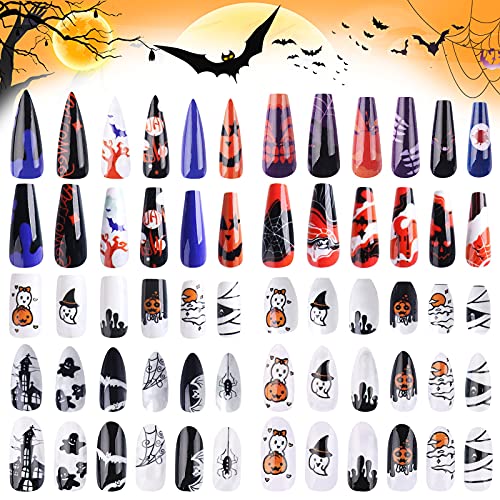 DIVERTENTI DISEGNI DI HALLOWEEN - Le unghie finte a copertura totale con vari motivi di simboli di Halloween sono in linea con gli accessori di moda di Halloween, comprese le classiche immagini in stile Halloween: fantasma, ragnatela ecc;